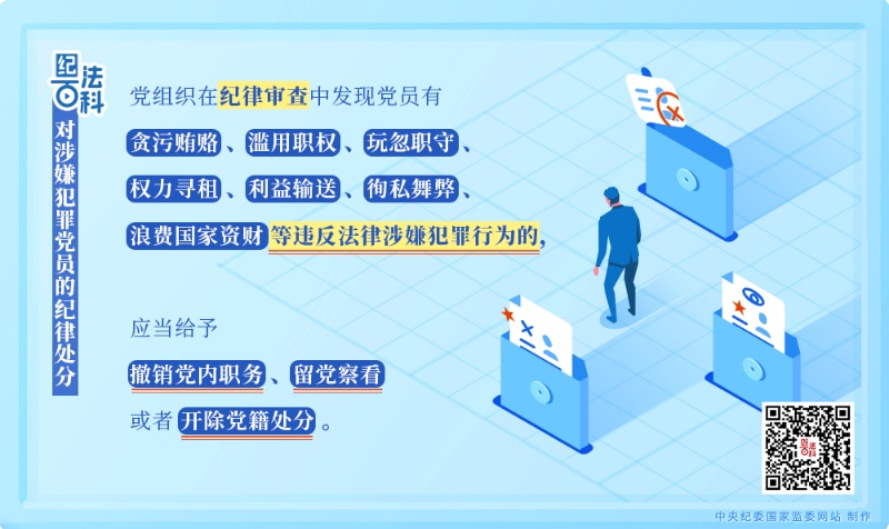 第二十九條規(guī)定,黨組織在紀律審查中發(fā)現(xiàn)黨員有貪污賄賂、濫用職權(quán)、玩忽職守、權(quán)力尋租、利益輸送、徇私舞弊、浪費國家資財?shù)冗`反法律涉嫌犯罪行為的,應(yīng)當給予撤銷黨內(nèi)職務(wù)、留黨察看或者開除黨籍處分。