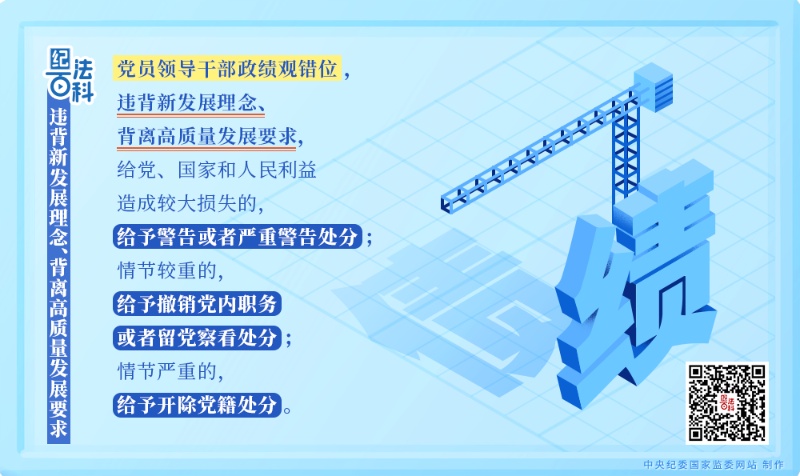 《中國共產(chǎn)黨紀律處分條例》第五十七條規(guī)定:黨員領(lǐng)導(dǎo)干部政績觀錯位,違背新發(fā)展理念、背離高質(zhì)量發(fā)展要求,給黨、國家和人民利益造成較大損失的,給予警告或者嚴重警告處分;情節(jié)較重的,給予撤銷黨內(nèi)職務(wù)或者留黨察看處分;情節(jié)嚴重的,給予開除黨籍處分。