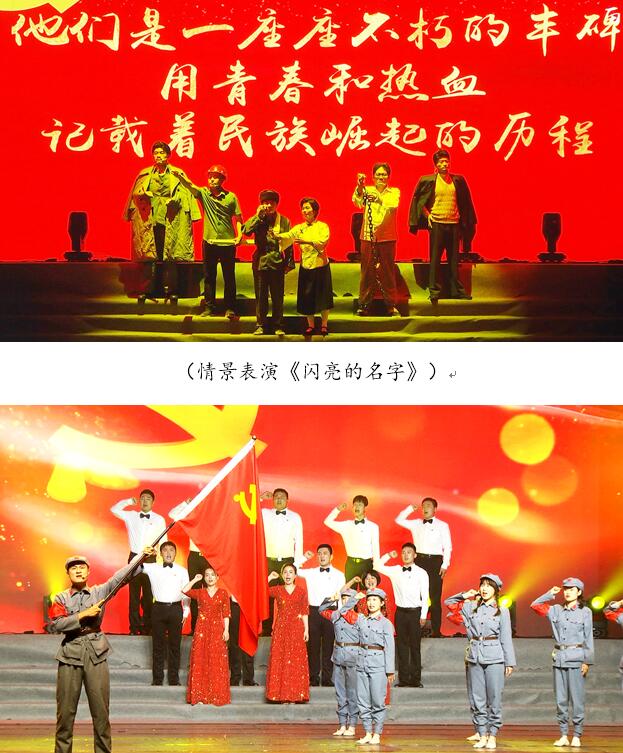 第一篇章中,《南湖的船 黨的搖籃》以歌伴舞的形式再現(xiàn)100年前,十三名水手在南湖紅船匯合那歷史性的一刻;詩(shī)朗誦《走進(jìn)七月》飽含激情、充滿力量,將歷史的燭火重新點(diǎn)燃,將沉睡的記憶再次喚醒;“繁霜盡是心頭血,灑向千峰秋葉丹”,情景表演《紅梅贊》《閃亮的名字》用生動(dòng)的表演,重現(xiàn)中國(guó)共產(chǎn)黨人用青春和熱血書寫奮斗的篇章,感人至深,催人淚下;歌曲《唱支山歌給黨聽》用最美的歌聲,唱出水設(shè)人愛黨之心,點(diǎn)燃觀眾愛國(guó)熱情。