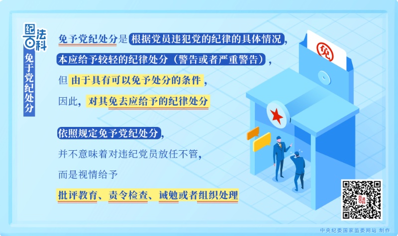免予黨紀處分是根據(jù)黨員違犯黨的紀律的具體情況,本應(yīng)給予較輕的紀律處分(警告或者嚴重警告),但由于具有可以免予處分的條件,因此,對其免去應(yīng)給予的紀律處分。依照規(guī)定免予黨紀處分,并不意味著對違紀黨員放任不管,而是視情給予批評教育、責(zé)令檢查、誡勉或者組織處理。