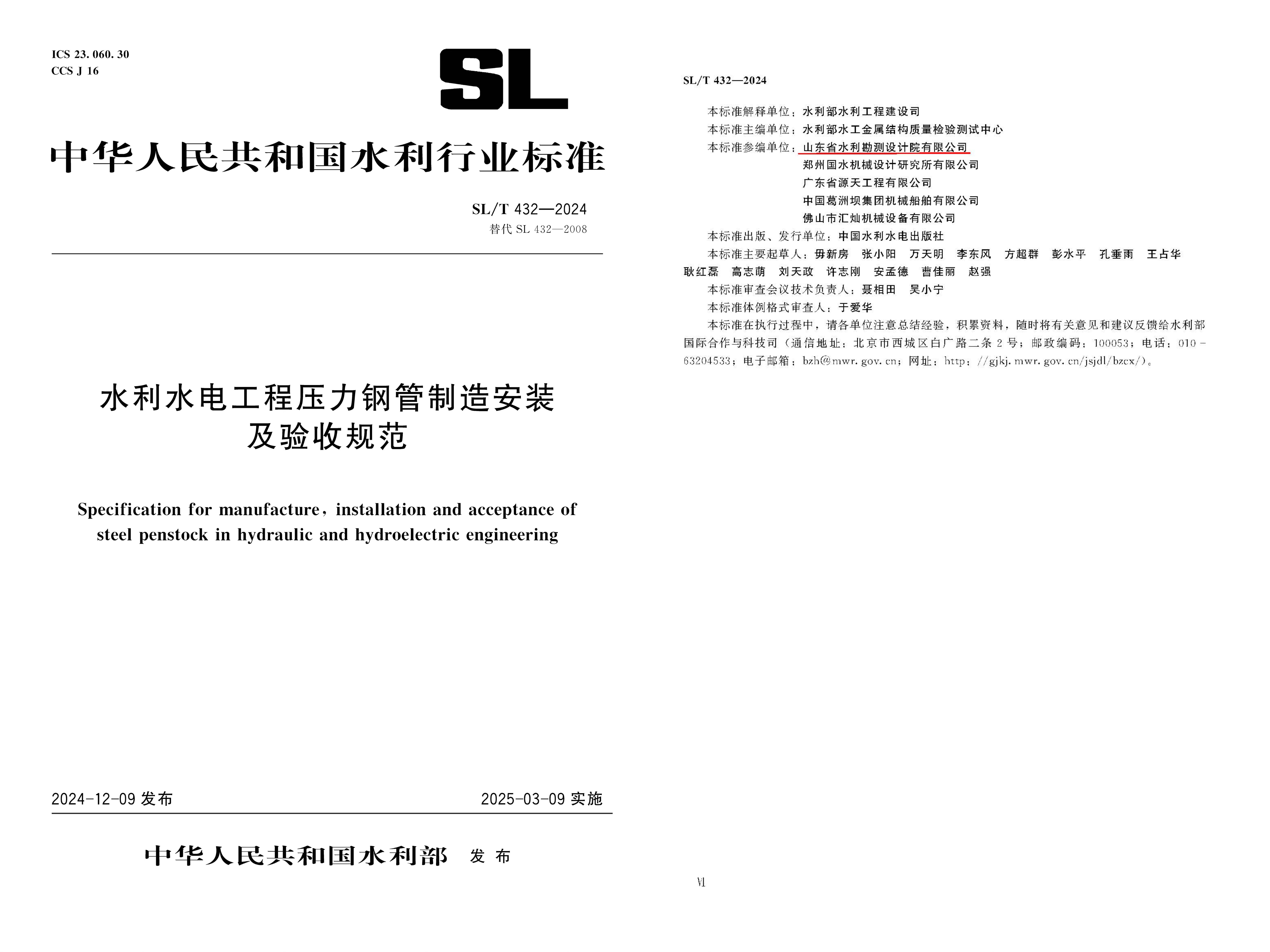 近日,由山東水設(shè)作為主要參編單位參與編制的《水利水電工程壓力鋼管制造安裝及驗(yàn)收規(guī)范》(SL/T 432—2024)經(jīng)水利部批準(zhǔn),正式面向全國發(fā)布實(shí)施。該規(guī)范是我國在壓力鋼管制造安裝與驗(yàn)收領(lǐng)域的重要技術(shù)規(guī)范,自2008年發(fā)布以來,被水利行業(yè)設(shè)計(jì)、制造、安裝、監(jiān)理、檢測(cè)等單位廣泛采用,是水利工程壓力鋼管制造、安裝及驗(yàn)收的重要依據(jù),在規(guī)范我國水利工程壓力鋼管制造、安裝及驗(yàn)收工作中發(fā)揮了重要作用。但隨著我國引調(diào)水工程、抽水蓄能電站和泵站工程的發(fā)展,其適用范圍已不能滿足現(xiàn)狀水利水電工程建設(shè)的需要。本次修訂可加強(qiáng)對(duì)整個(gè)水利水電行業(yè)壓力鋼管的質(zhì)量管理,規(guī)范壓力鋼管行業(yè)發(fā)展,提高壓力鋼管的可靠性和企業(yè)技術(shù)水平,對(duì)保證水利工程壓力鋼管安全運(yùn)行起到重要的技術(shù)支撐作用。