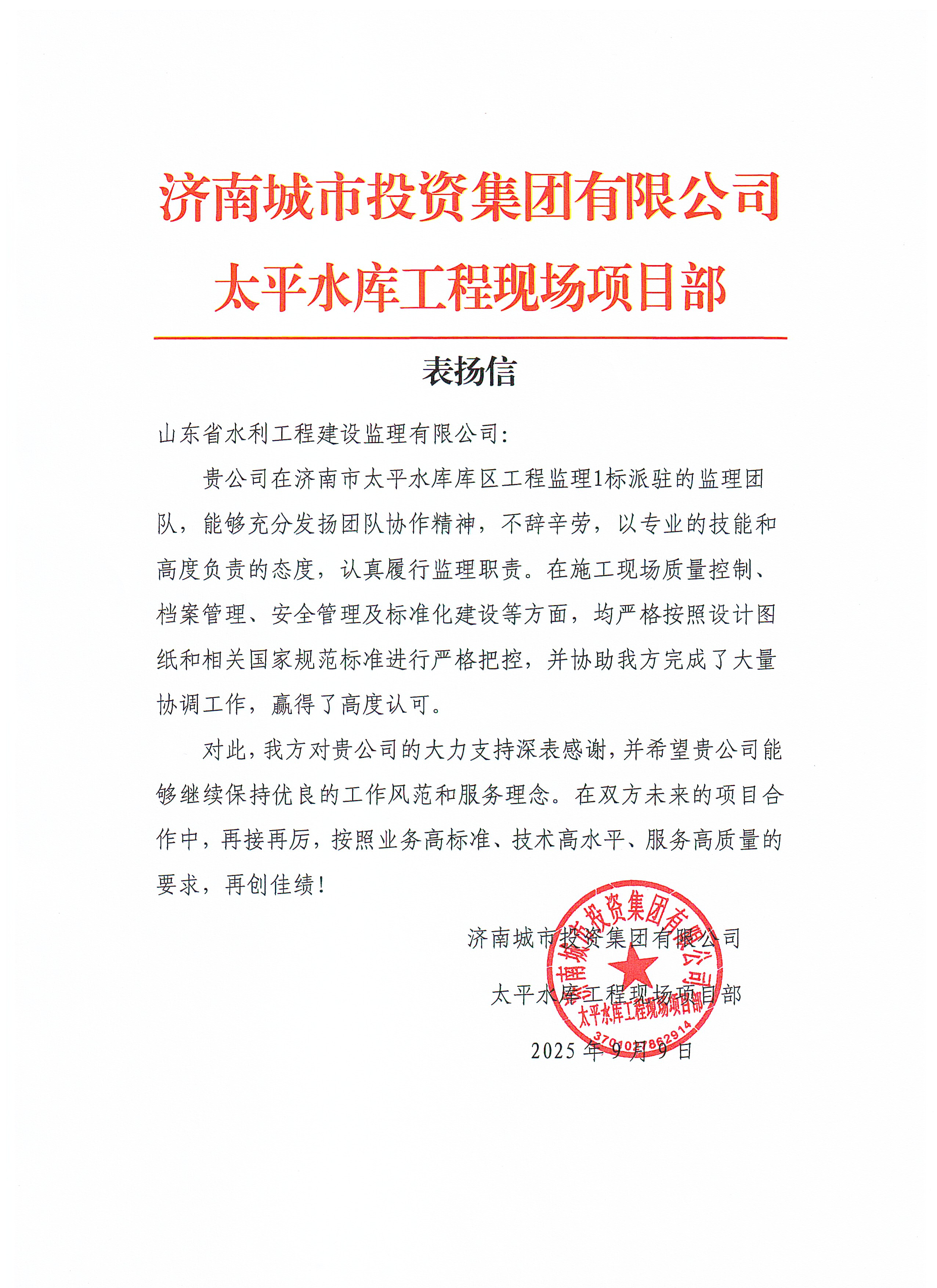 近日,濟(jì)南城市投資集團(tuán)有限公司向山東省水利工程建設(shè)監(jiān)理有限公司發(fā)來表揚(yáng)信,對濟(jì)南市太平水庫監(jiān)理團(tuán)隊(duì)的協(xié)作精神、專業(yè)技能以及認(rèn)真履職、高度負(fù)責(zé)的態(tài)度給予了高度肯定。
